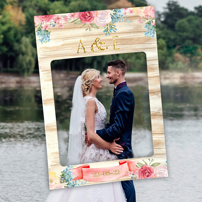 Κάδρο Photo Booth με εφέ ξύλου και λουλούδια σε διάφορα χρώματα, μια όμορφη ιδέα για να διακοσμήσετε το χώρο του γάμου και ένα μοναδικό φόντο για τις φωτογραφίες σας!