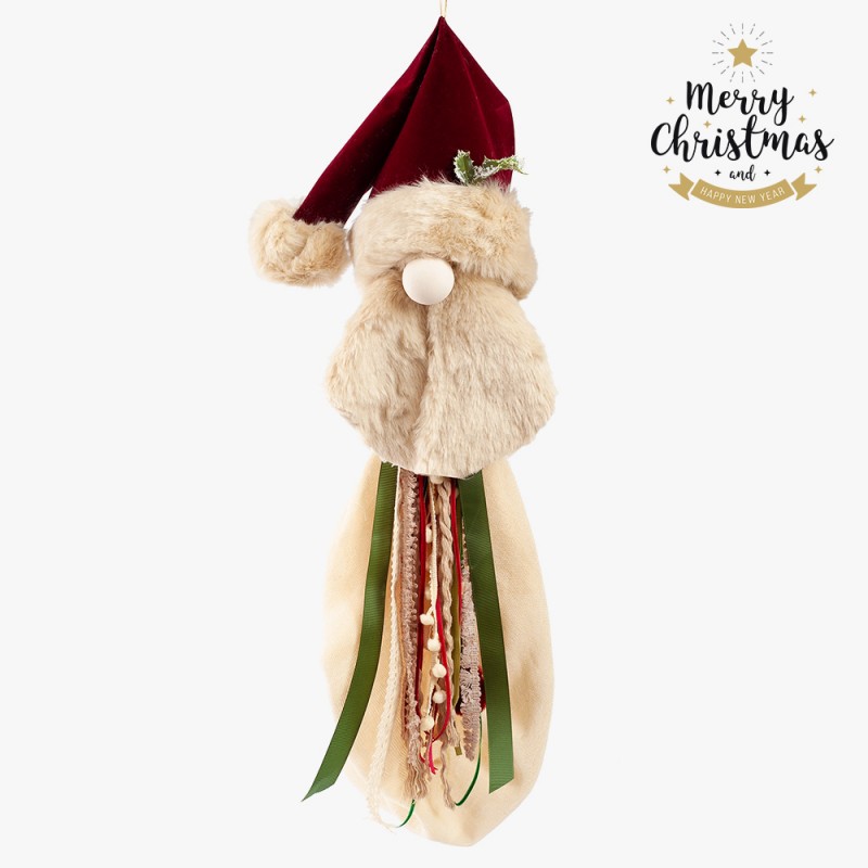 Κρεμαστός υφασμάτινος Άγιος Βασίλης με σάκο για τα χριστουγεννιάτικα δώρα σας. Είναι διακοσμημένος με κορδέλες και κορδόνια.