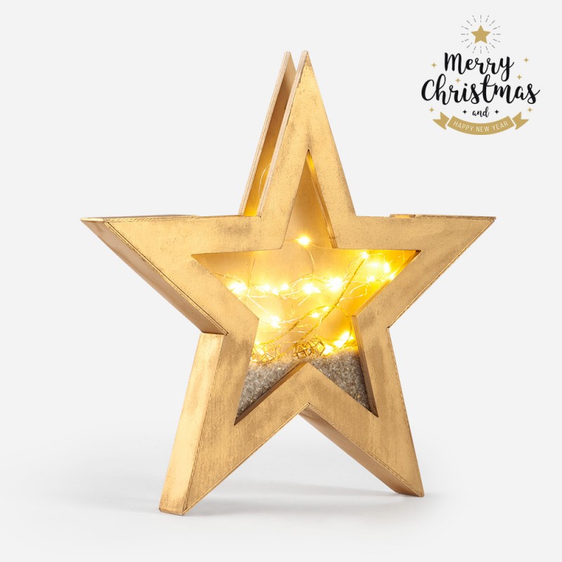 Ξύλινο διακοσμητικό αστέρι με plexiglass σε χρυσό χρώμα με led φωτάκια. Μέσα είναι στολισμένο με διακοσμητικό χιόνι και κοσμήματα με διαμαντάκι εσωτερικά. Τα φωτάκια λειτουργούν με μπαταρίες (3 τεμάχια ΑΑ).